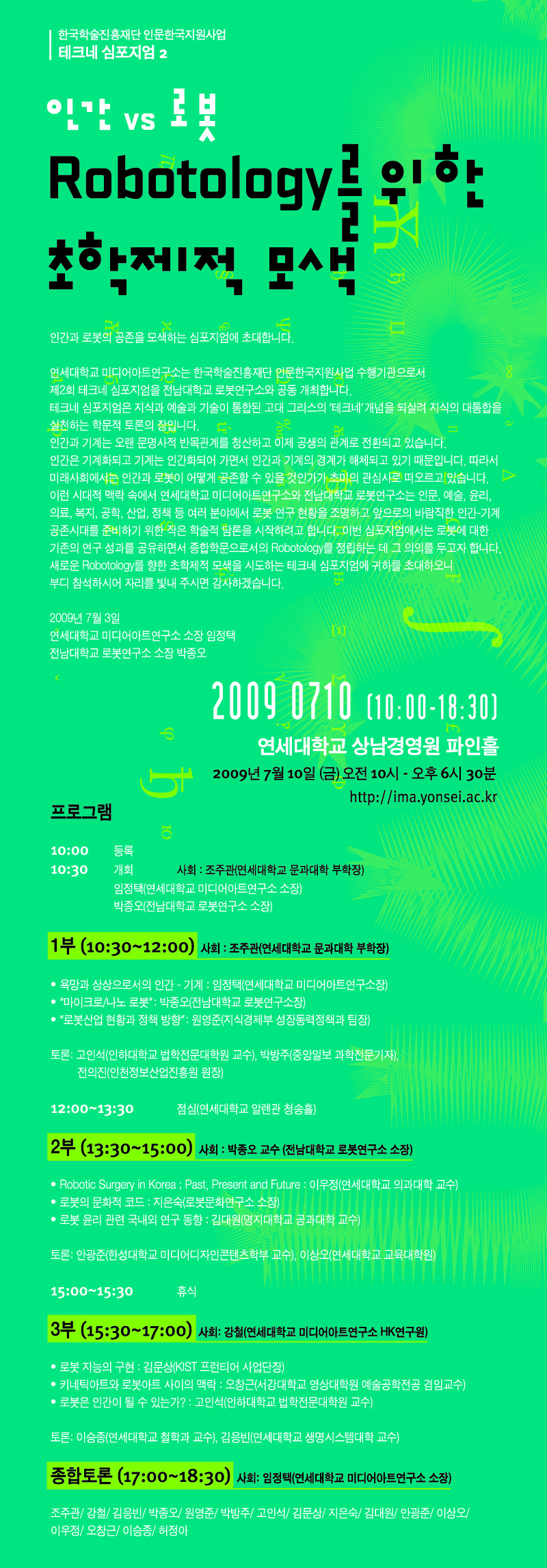 ![]() 안녕하십니까. 전남대학교 로봇연구소에서 안내말씀 드립니다. 오는 7월 10일 금요일, 연세대학교 미디어아트연구소와 저희 로봇연구소 공동으로 아래와 같이 테크네 심포지엄을 개최 합니다. o 행사명 : 인간 Vs. 로봇, Robotology를 위한 초학제적 모색 o 개최일 : 2009년 7월 10일 금요일, 오전 10시 o 장 소 : 연세대 상남경영원 파인홀 이날 심포지엄에는 원영준 지식경제부 성장동력정책과 팀장, 김문상 KIST 프론티어사업단장, 박방주 중앙일보 과학전문기자 등 로봇관련 정부 및 미디어 관계자는 물론, 저희 박종오 소장님을 비롯한 로봇개발자, 그리고 지은수 로봇문화연구소장 등 인문사회계열 인사들이 총 참가하여 미래사회에서의 인간과 로봇의 공존에 대한 검토의 장이 될 것입니다. 자세한 행사내용은 첨부된 초대장을 참고하시기 바라며, 관심 있는 분들의 많은 참여를 요청 드립니다. |